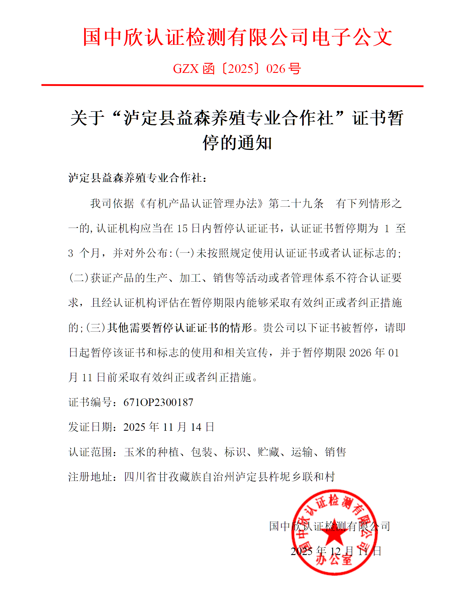 GZX函〔2025〕026号-关于“泸定县益森养殖专业合作社”证书暂停的通知