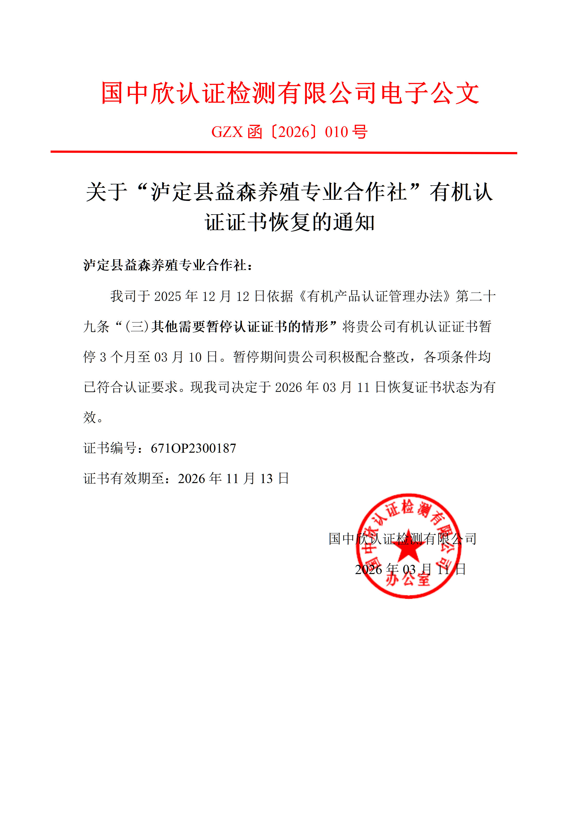 GZX函〔2026〕010号-关于“泸定县益森养殖专业合作社“有机认证证书恢复的通知_01